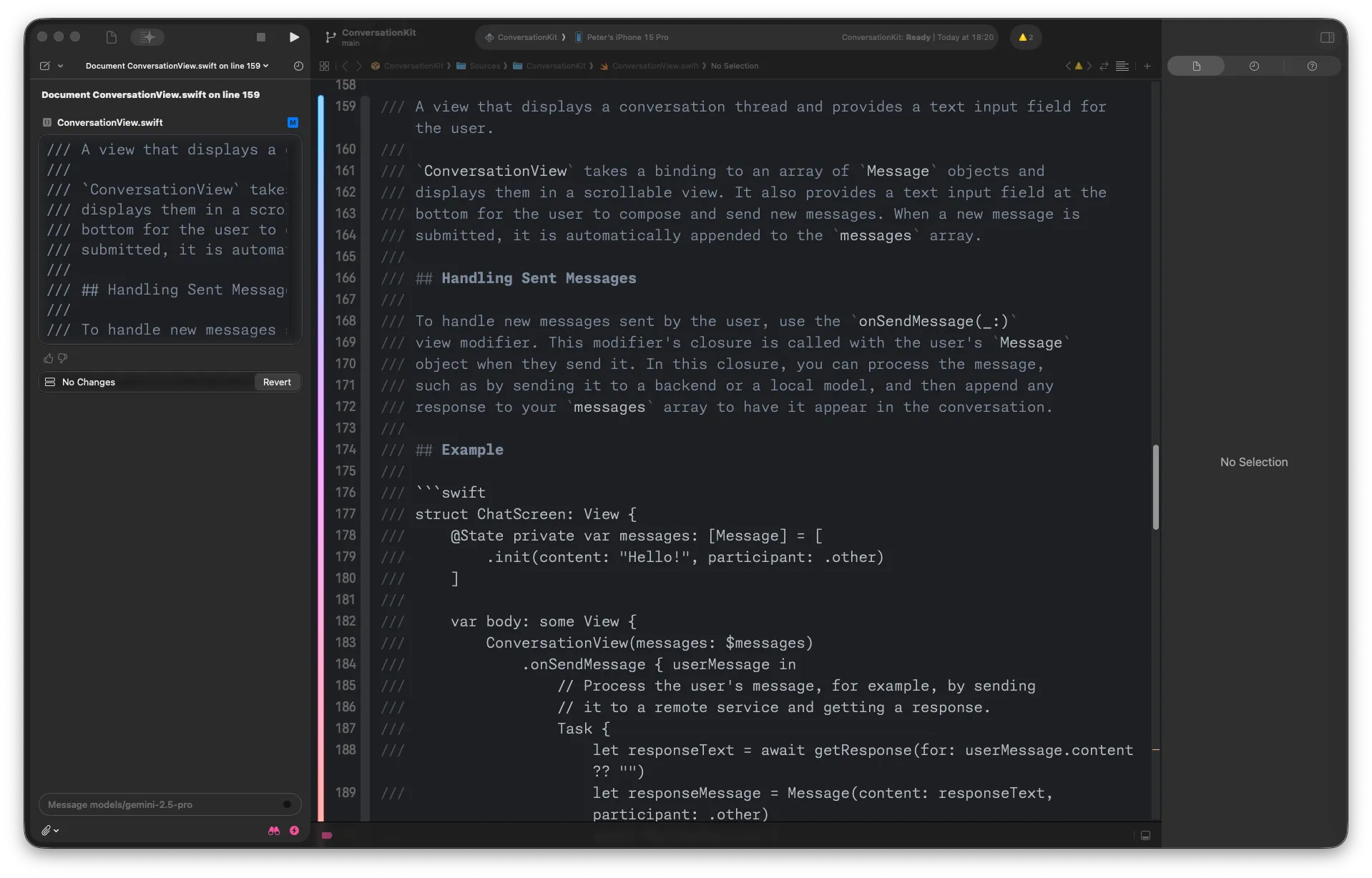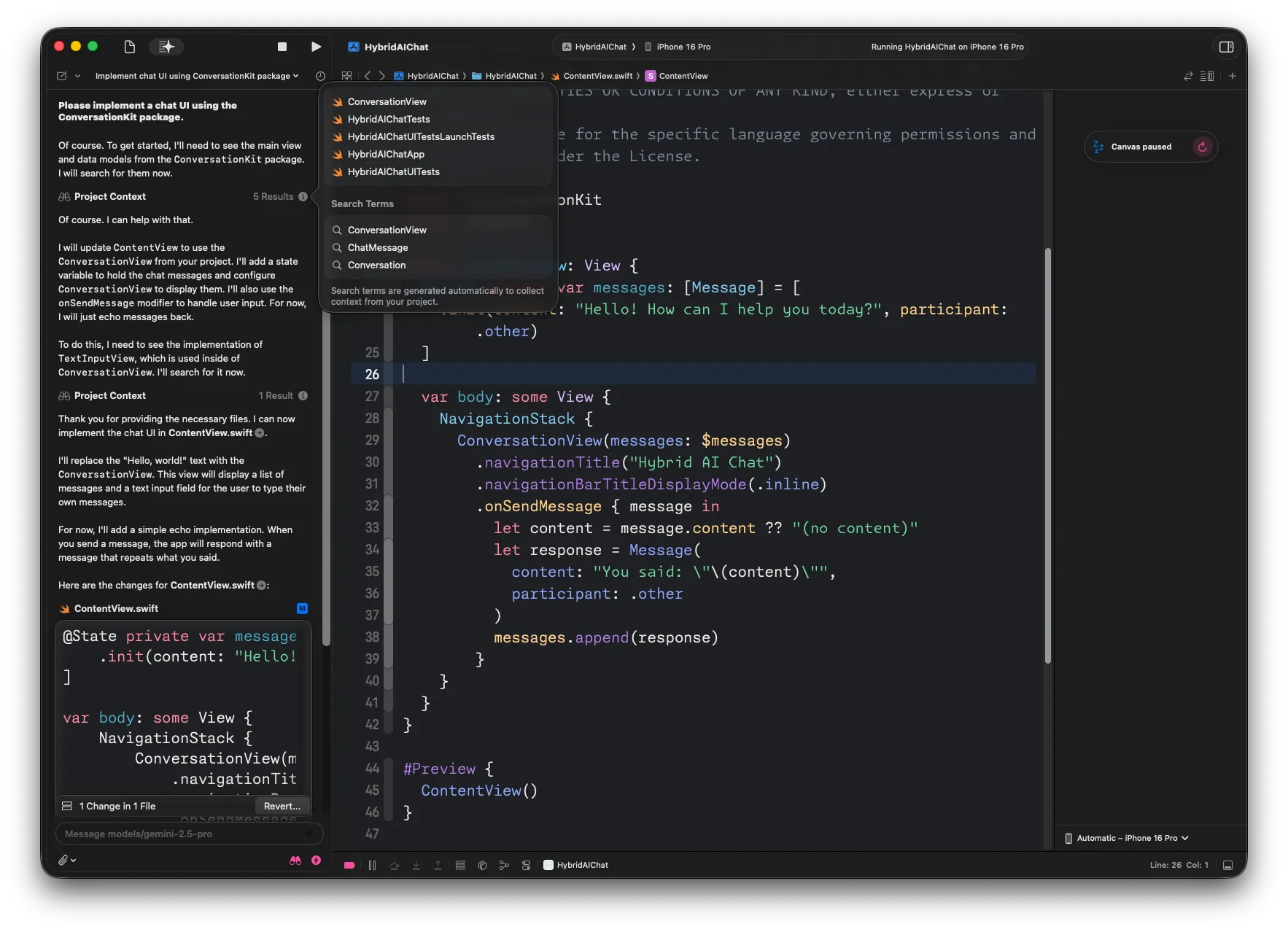 Please implement a chat UI using the ConversationKit package. From the screenshot above, you can see that Coding Intelligence and Gemini then take a couple of turns to search the code (for example, the source code for ConversationView) that’s necessary for the model to understand the API of the ConversationKit SDK, and ultimately implement the chat UI.